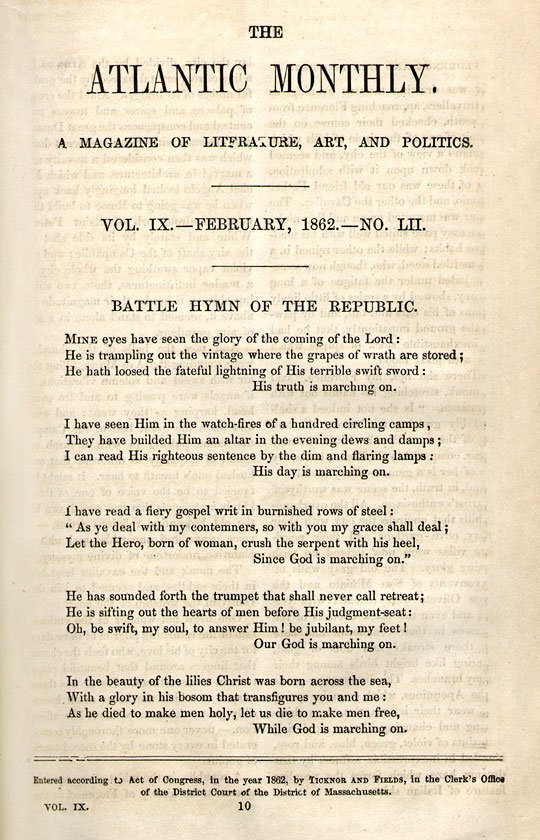 Written by Julia Ward Howe, the text of America’s most famous Civil War-era song was said to have been penned by Howe in 1861 after hearing soldiers singing during a public review of Union troops. The stirring words, set to the tune of “John Brown’s Body,” were published in the February 1862 edition of The Atlantic Monthly. (Public Domain image.)
