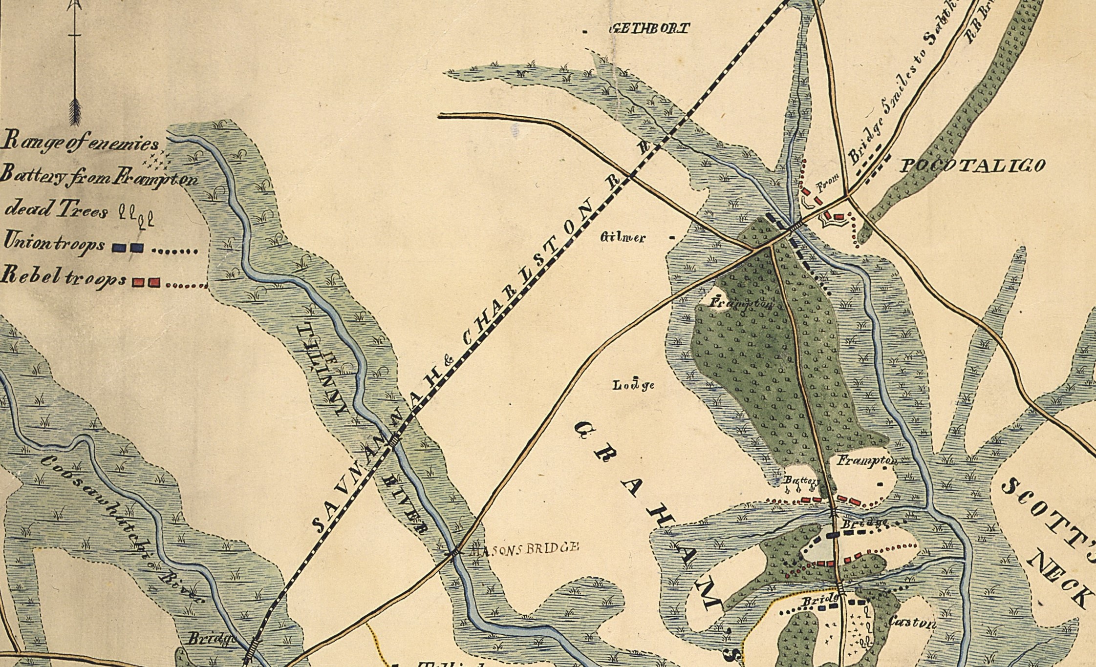 Excerpt from the U.S. Army map of the Pocotaligo-Coosawhatchie Expedition, October 22, 1862, showing the Caston and Frampton plantations in relation to the town of Pocotaligo, the Pocotaligo bridge and the Charleston & Savannah Railroad (public domain).