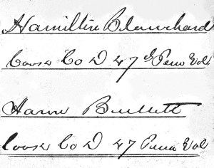 One of several U.S. Civil War Pension documents that confirmed the Union Army enrollment of Hamilton Blanchard and Aaron Bullard, known later as Aaron French, as Cooks (a higher rank than under-cook) with Company D of the 47th Pennsylvania Volunteer Infantry (U.S. Civil War Pension Files, U.S. National Archives and Records Administration, public domain).
