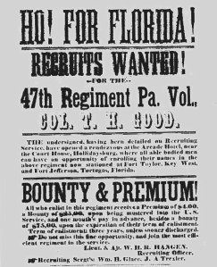This Civil War-era recruiting flyer documents the service of the 47th Pennsylvania Volunteer Infantry at Forts Taylor and Jefferson, Florida, under the leadership of Colonel Tilghman Good, as well as the premium and bounty added to standard pay to inspire more men to enlist (public domain).