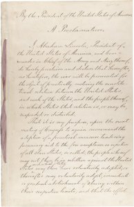Page one of the Emancipation Proclamation issued by U.S. President Abraham Lincoln, January 1, 1863 (U.S. National Archives and Records Administration, public domain; click to enlarge).
