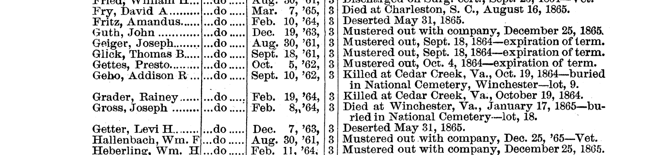 4. “Roll of Co. F., 47th Regiment, Infantry,” in Registers of Pennsylvania Volunteers, 1861-1865, in “Records of the Department of Military and Veterans’ Affairs.” Harrisburg, Pennsylvania: Pennsylvania State Archives, retrieved online February 10, 2020.
