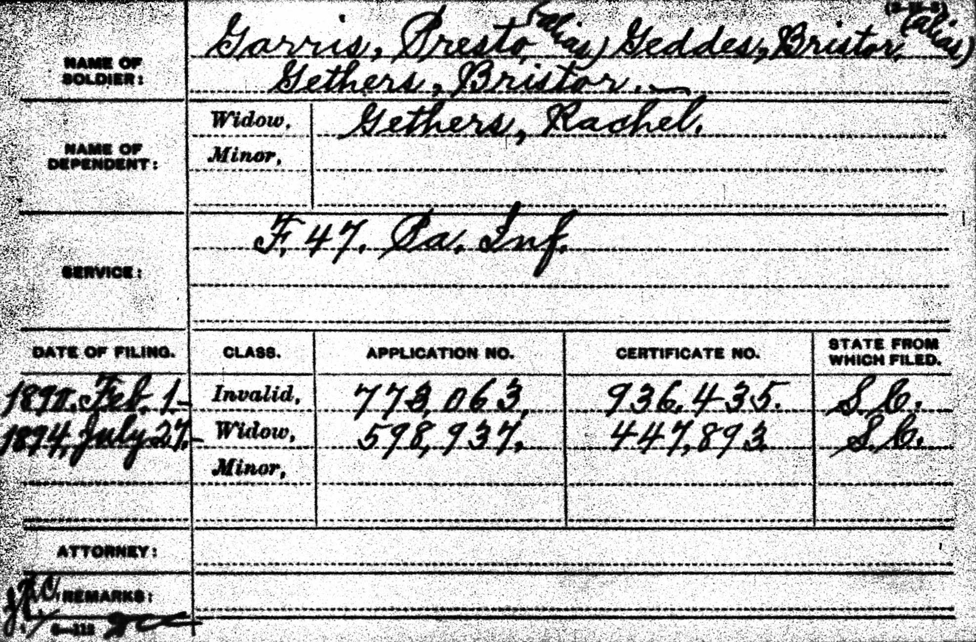 Fortunately, this soldier’s listing in the U.S. Civil War General Pension Index Card system was slightly more helpful, providing multiple “alias” (alternate) spellings of his name: “Presto Garris,” “Bristor Geddes,” and “Bristor Gethers,” as well as a potential spelling for the name of his wife, “Rachel Gethers,” and a possible place of residency and year of death—1894—because his widow had filed for a U.S. Civil War Widow’s Pension from South Carolina on July 27, 1894.