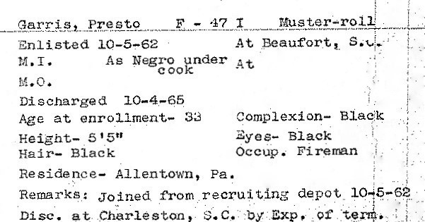 Listing for “Presto Garris,” Company F, 47th Pennsylvania Volunteers, Civil War Veterans’ Card File, 1861-1866, Pennsylvania State Archives (public domain).