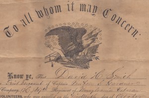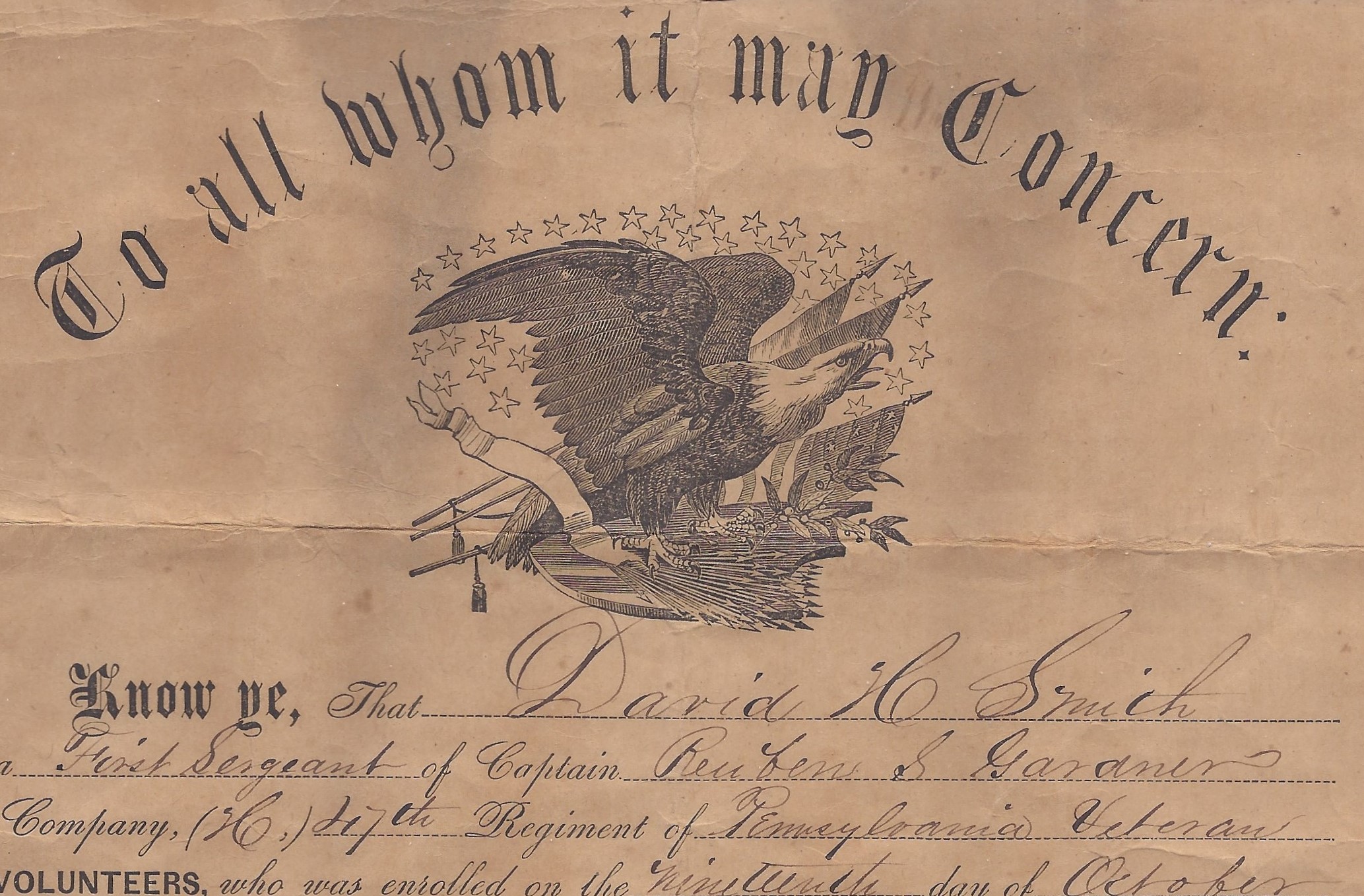 Honorable Discharge (excerpt), First Sergeant David H. Smith, Company H, 47th Pennsylvania Volunteers, December 25, 1865 (public domain).