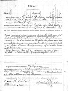 “I was married about 14 years before the late War of the Rebellion, on Mr. Pringle plantation, in Georgetown County, S.C. I do not know the date, but from our crops we make for our former master I judged it was about 14 years before the war that I got married to Bristo Geddes by slave custom.” — Rachael (Richardson) Gethers, excerpt from an affidavit filed by her attorney on February 12, 1895