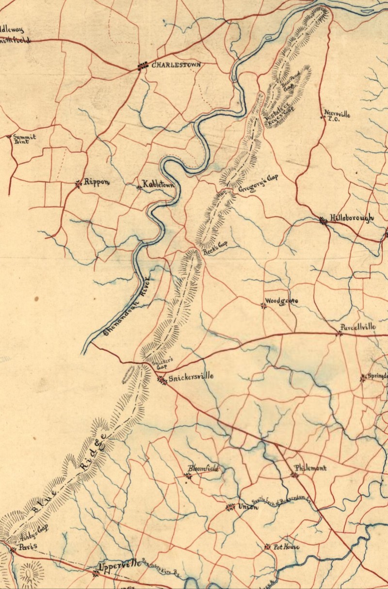 Snicker’s Gap, Virginia in relation to Charlestown, West Virginia, July 1864 (Hotchkiss map excerpt, U.S. Library of Congress, public domain; click to enlarge).