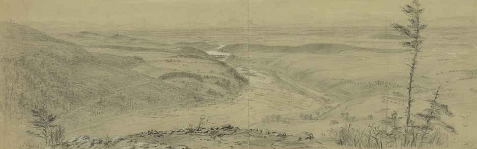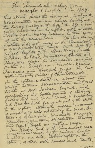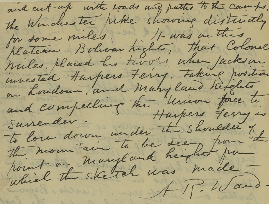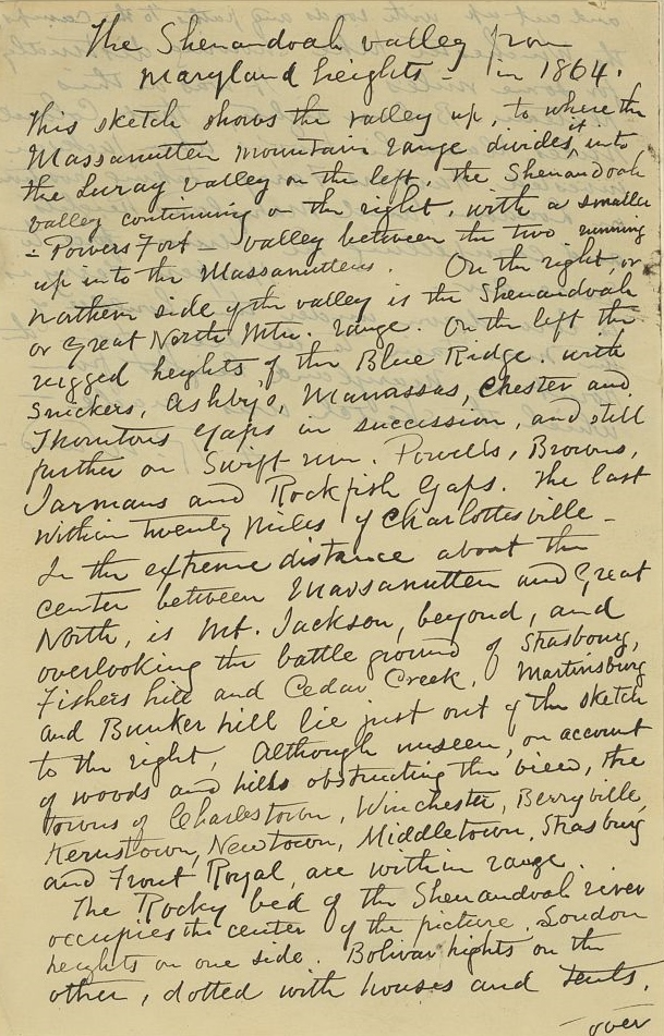 The Rocky bed of the Shenandoah river occupies the center of the picture. Loudon heights on one side. Bolivar heights on the other, dotted with houses and tents, and cut up with roads and paths to the camps, the Winchester pike showing distinctly for some miles. It was on this plateau – Bolivar heights, that Colonel Miles placed his troops when Jackson invested Harpers Ferry, taking position on Loudoun, and Maryland heights and compelling the Union force to surrender. Harpers Ferry is to [sic, “too”] low down under the shoulder of the mountain to be seen from the point on Maryland heights from which the sketch was made.