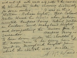 Wharton’s writings back up Nichols’ account of the Kelly’s Ford experience, and also confirm that the 47th Pennsylvania Volunteers (Companies A, C, D, E, F, H, and I) did indeed engage in the Battle of Cool Spring/Snicker’s Gap: