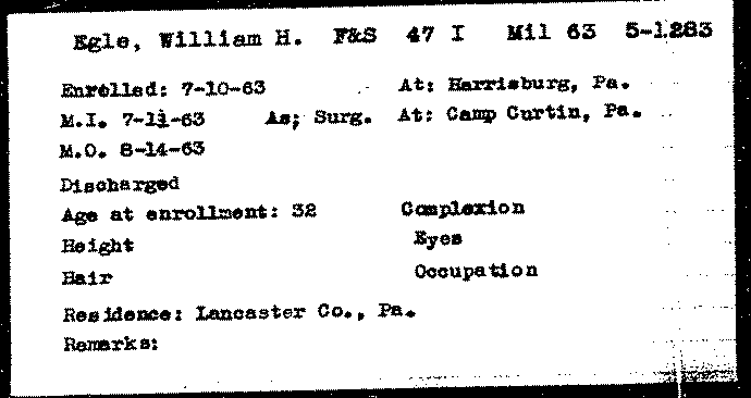 The index card of William H. Egle, M.D. shows that this soldier served with the 47th Pennsylvania Militia, Emergency of 1863 and not the 47th Pennsylvania Volunteer Infantry (Pennsylvania Civil War Veterans Card File, 1861-1866, courtesy of the Pennsylvania State Archives).