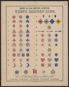 Army of the United States, Corps Badges, 1865 (U.S. Library of Congress, public domain; click to enlarge).