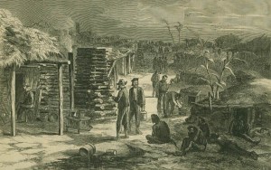 This image depicts life at Camp Ford, the largest Confederate Army prison camp west of the Mississippi River (Harper’s Weekly, March 4, 1865, public domain).