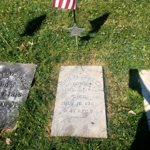 Walls, Benjamin: Regimental Color-Sergeant, Company C; sustained gunshot wound to his left shoulder while trying to mount the 47th Pennsylvania’s flag on a piece of Confederate artillery that had been re-captured by the regiment; recovered and attempted to re-enlist, but was denied permission due to his age. (At sixty-seven, he was the oldest man to serve in the entire regiment.) Was honorably discharged upon expiration of his three-year term of service on September 18, 1864.