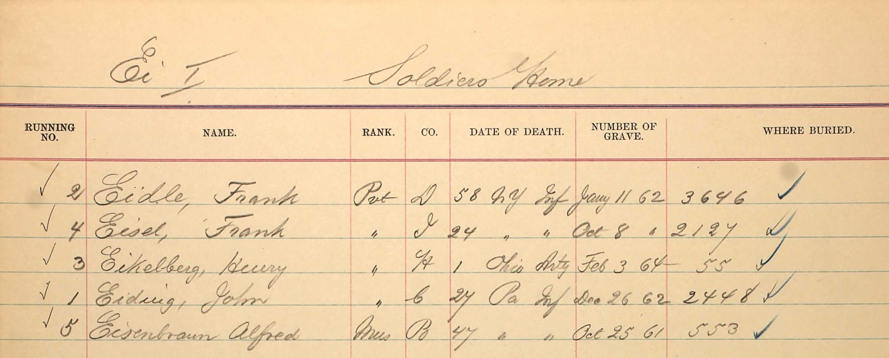 Laid to rest in Section F, Grave No. 553 at the Military Asylum Cemetery (now known as the U.S. Soldiers’ and Airmen’s Home Cemetery), Alfred Eisenbraun was the second member of the regiment to die. The first was fellow drummer boy, John Boulton Young, a 13-year-old who was felled by smallpox while serving with the 47th’s Company C.