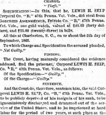 According to a Supplement to the Charleston Daily News, which was published on 11 October 1865, Corporal Lewis Seip of the 47th Pennsylvania was charged with theft from fellow B Company soldier Private Godfrey Assenheimer. The newspaper presented the details of Seip’s court martial case as follows: