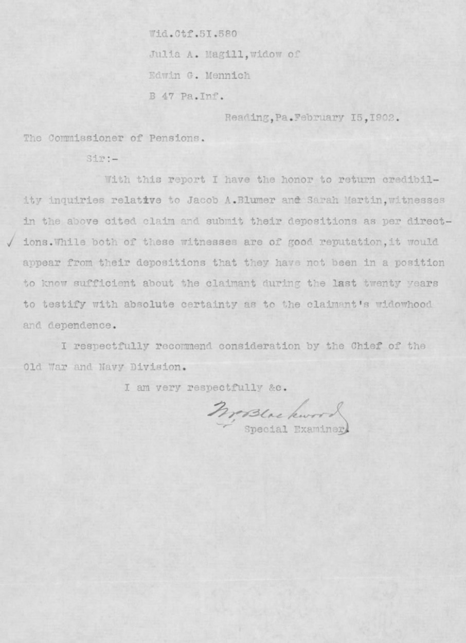 Julia (Minnich) Magill’s 1896 U.S. Civil War Nurse’s Pension Claim, 15-17 February 1902 Credibility Report, p. 2 (U.S. Civil War Nurses’ Pension Files, U.S. National Archives and Records Administration, public domain).