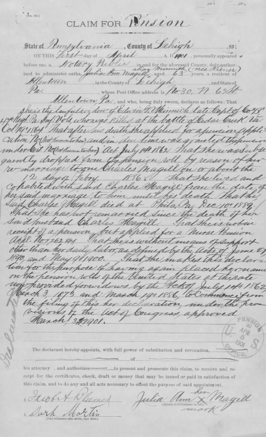 Julia (Minnich) Magill’s 1896 U.S. Civil War Nurse’s Pension Claim, Blumer-Martin-Magill Attestation, 1 April 1901, p. 1 (U.S. Civil War Nurses’ Pension Files, U.S. National Archives and Records Administration, public domain).