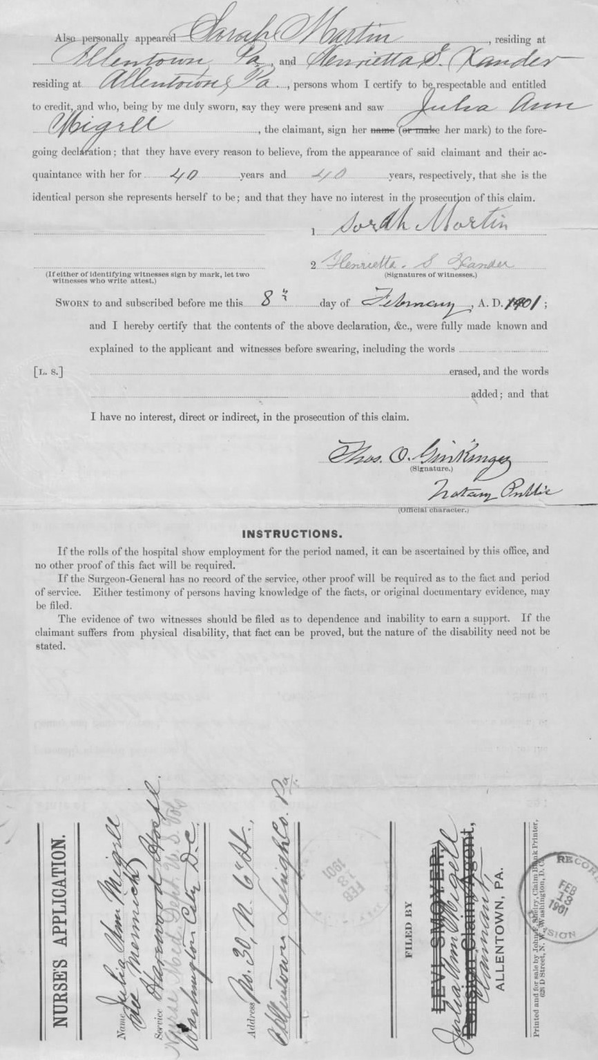 Julia (Minnich) Magill’s 1896 U.S. Civil War Nurse’s Pension Claim, Declaration for Nurse’s Pension, 8 Feb 1901, p. 2 (U.S. Civil War Nurses’ Pension Files, U.S. National Archives and Records Administration, public domain).