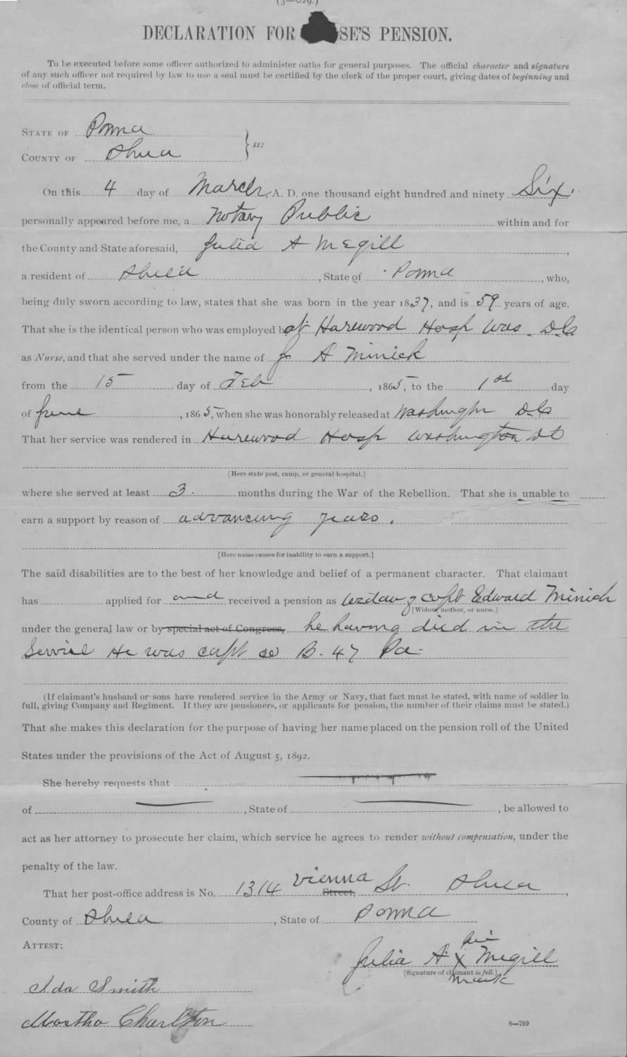 Julia (Minnich) Magill’s 1896 U.S. Civil War Nurse’s Pension Claim, Declaration for Nurse’s Pension, 8 Feb 1901, p. 3 (U.S. Civil War Nurses’ Pension Files, U.S. National Archives and Records Administration, public domain).
