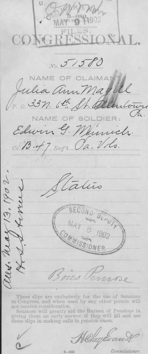 Julia Minnich Magill_U.S. Civil War Nurse’s Pension Claim, 1896_May 1902 Pension Status, p. 1_pubdom