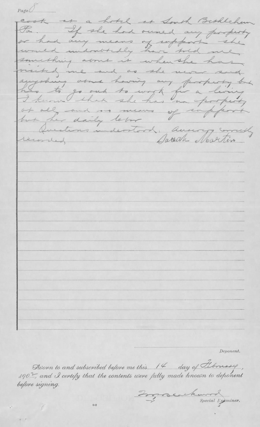 Julia Ann Minnich Magill_U.S. Civil War Nurse Pension Claim, 1896_Sarah Martin’s Deposition, 14 Feb 1902, p. 2