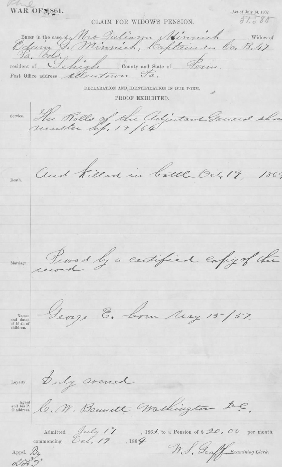 Juliann (Kuehner) Minnich’s Initial U.S. Civil War Widow’s Pension Claim (completed claim form, U.S. Civil War Widows’ Pension Files, U.S. National Archives and Records Administration, public domain).