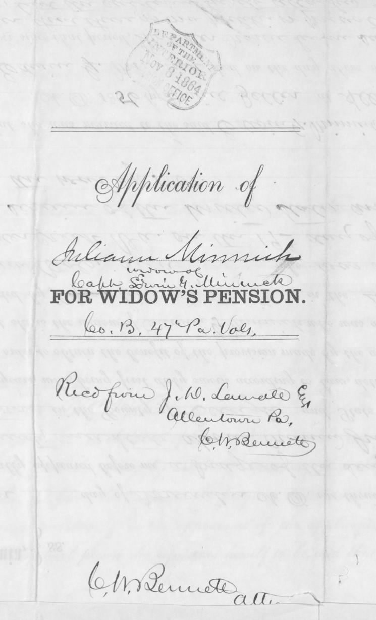 Minnich, Edwin_Julia Minnich, U.S. Civil War Widow’s Pension Claim, Cover Sheet