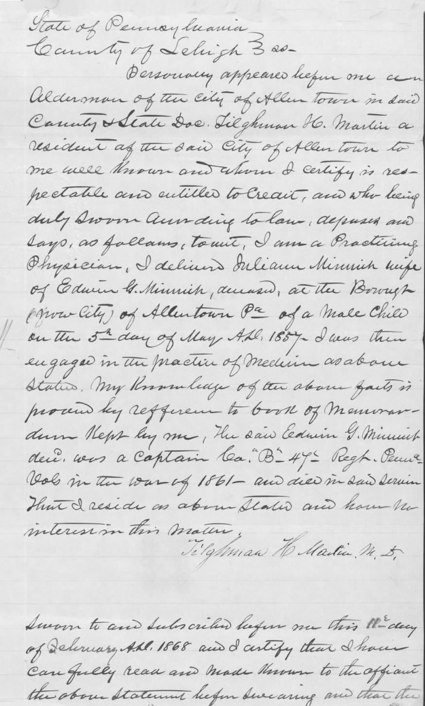 Physician’s Attestation Re: Marriage of Edwin and Julia Minnich and Birth of Their Son, George, p. 1 (U.S. Civil War Widows’ and Orphans’ Pension Files, U.S. National Archives and Records Administration, public domain).