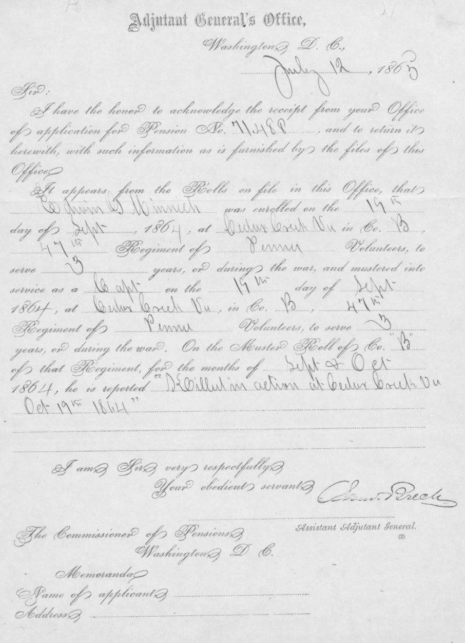 U.S. Adjutant General’s 3 July 1865 Communication Re: 47th Pennsylvania Volunteers’ Service of Captain Edwin G. Minnich and His 1864 Death (Records of the U.S. Adjutant General’s Office, U.S. National Archives and Records Administration, public domain).