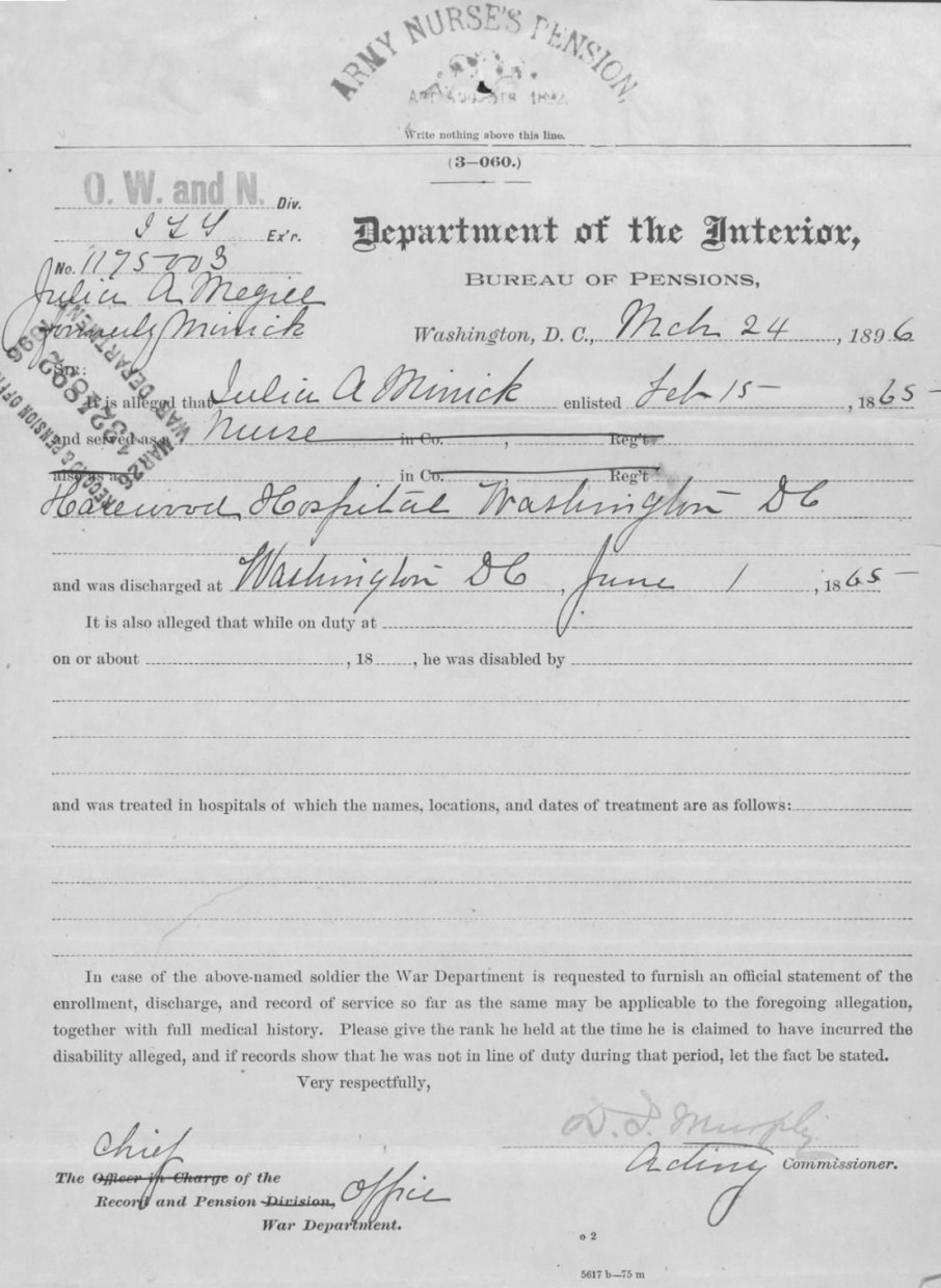U.S. Pension Bureau’s 24 Mar 1896 Communication Re Julia Minnich Magill’s 1865 U.S. Civil War Nurse Svc, Harewood Hospital_pubdom