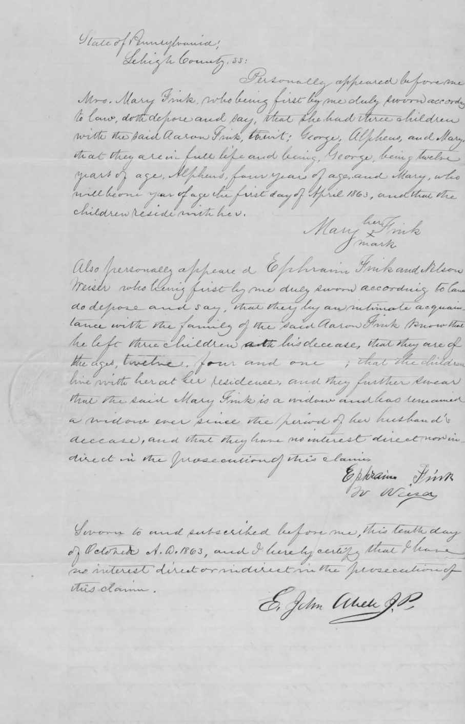 Mary Kemmerer Fink’s Widow’s Affidavit, 10 Oct 1863, p. 1_U.S. Civil War Widows’ Pension Files_pubdom