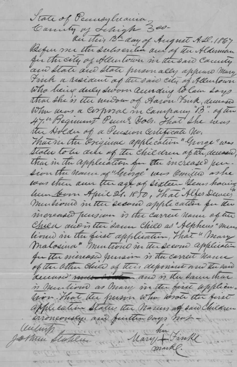 Mary Kemmerer Fink’s Widow’s 13 August 1867 Affidavit, p. 1 (U.S. Civil War Widows’ Pension Files, U.S. National Archives and Records Administration, public domain).