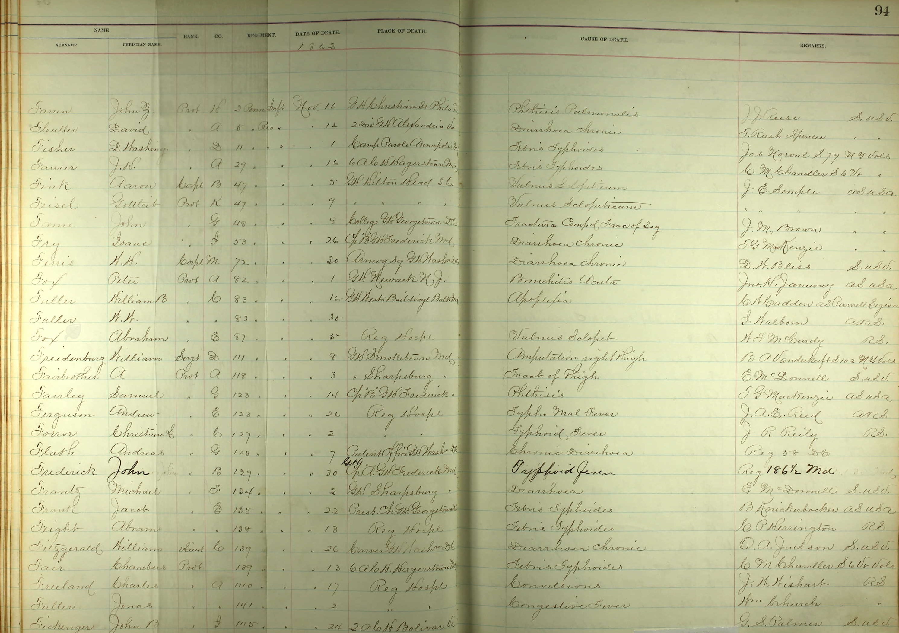 Corporal Aaron Fink’s Death Ledger Entry, U.S. Army Hospital, Hilton Head, South Carolina, 5 November 1862 (U.S. Registers of Deaths of Volunteer Soldiers, U.S. National Archives and Records Administration, public domain).