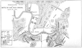 The 47th Pennsylvania Volunteers were stationed just to the left of the “Thick Woods” with Emory’s 2nd Brigade, 1st Division as shown on this map of Union troop positions for the Battle of Cane River at Monett’s Ferry, Louisiana, 23 April 1864 (Major-General Nathaniel Banks’ official Red River Campaign Report, public domain).