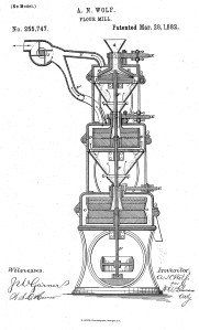 U.S. Patent application illustration for a flour mill, Abraham N. Wolf (1882, U.S.255,747, public domain).