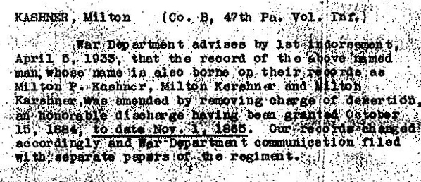 War Department furnished information on Apr 5, 1933 that charge of desertion was removed, and was honorably disch Oct 15, 1884 to date Nov 1, 1865, under provisions of Act of Congress approved July 5, 1884. In same [illegible word] as MILTON P. KASHNER and MILTON KARSHNER (see separate papers of Regt).