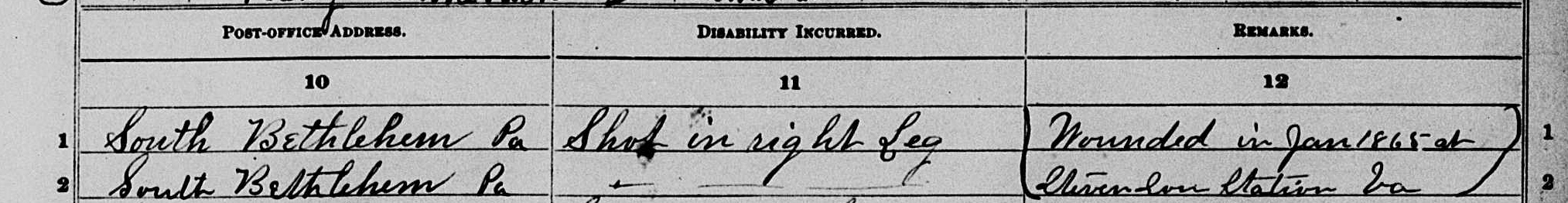 Right leg gunshot wound sustained by Private Milton P. Cashner in 1865 while serving with the 47th Pennsylvania (U.S. Census of Union Veterans and Widows of the Civil War, 1890, public domain; double click to enlarge).