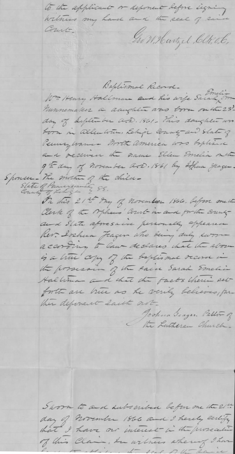Sarah E. Haltiman’s U.S. Civil War Widow’s Pension Claim, Affidavit, 21 Nov 1866, pp. 1-2_pubdom