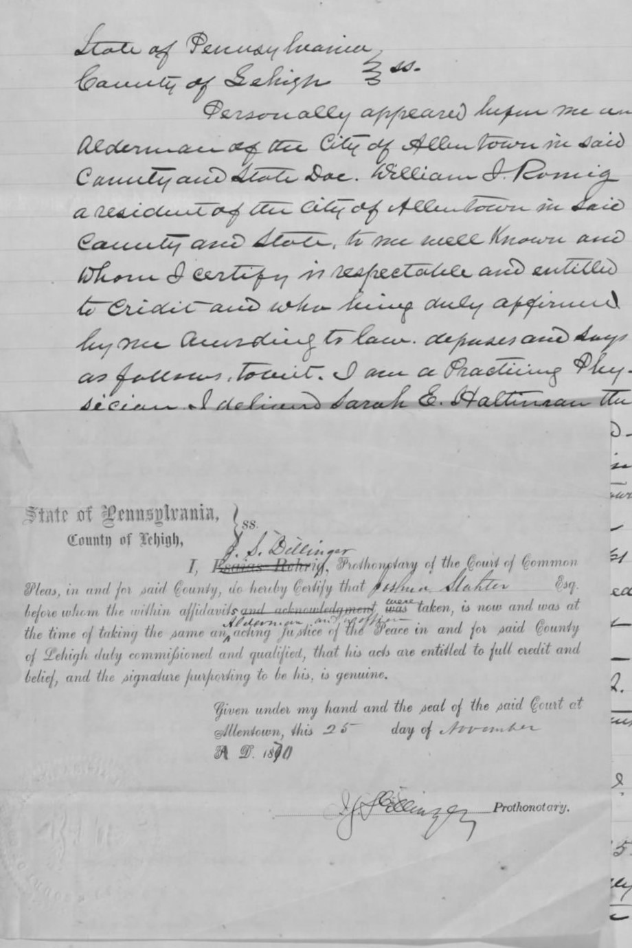 Sarah E. Haltiman’s U.S. Civil War Widow’s Pension Claim, July 1865 (physician Romig’s affidavit, 1870, p. 3, U.S. Civil War Widows’ Pension Files, U.S. National Archives and Records Administration, public domain).