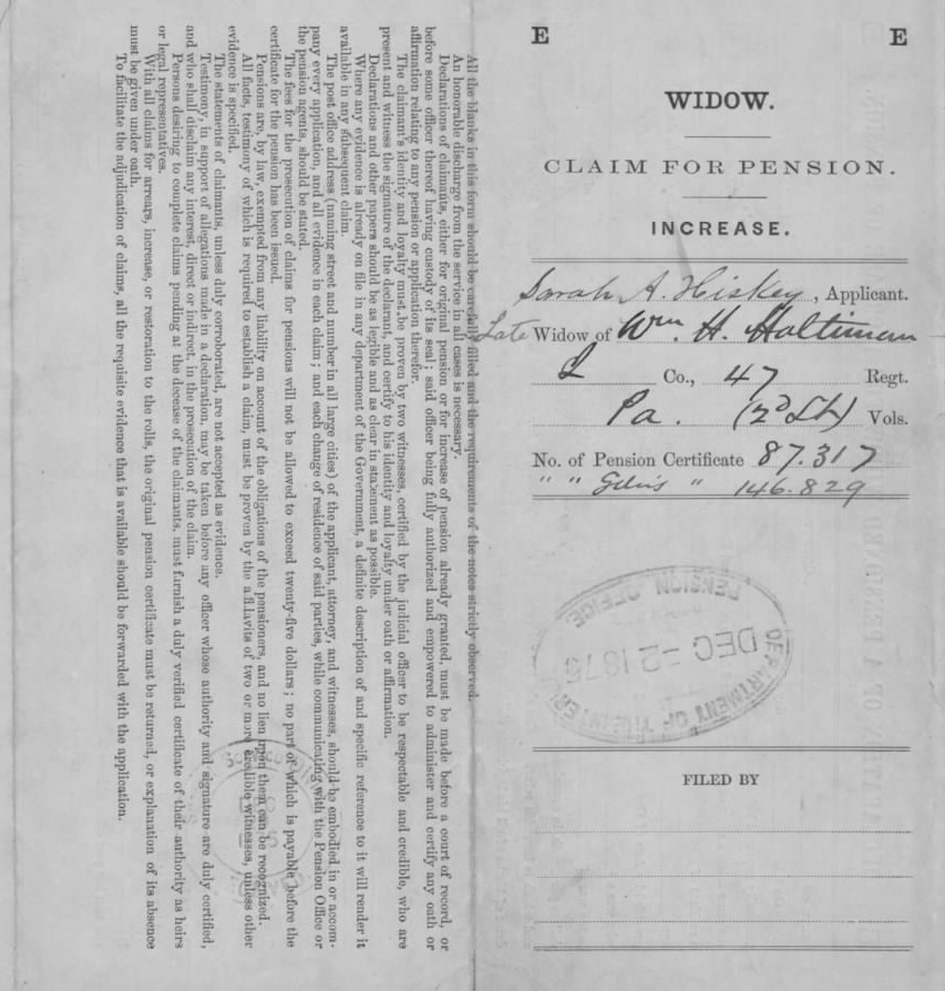 Sarah Haltiman-Hiskey’s U.S. Civil War Widow’s Pension (Declaration for Widow’s Pension Increase, 1875, p. 3, U.S. Civil War Widows’ Pension Files, U.S. National Archives and Records Administration, public domain).