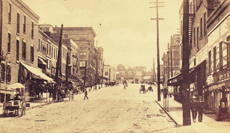 Market Street in Akron, Ohio, viewed from the bridge, looking east, 1880s (public domain; click to enlarge).