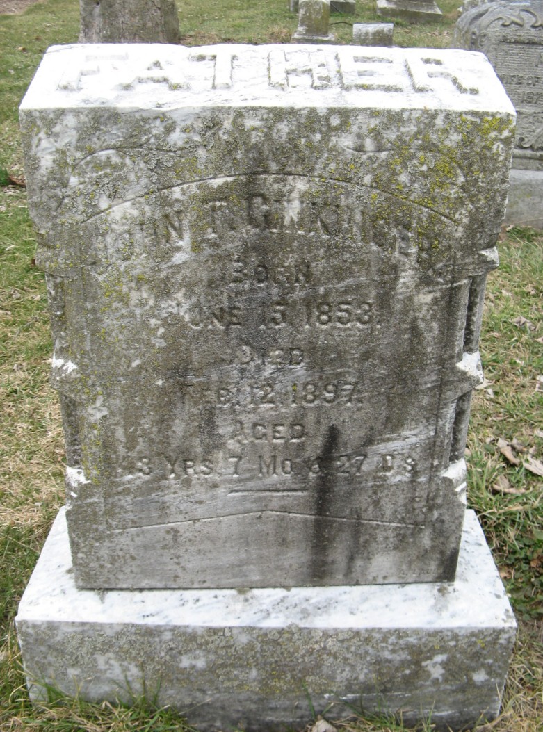 Headstone of Lafayette Knerr’s oldest stepson, John Thomas Ginkinger (1853-1897), Union-West End Cemetery, Allentown, Pennsylvania (used with permission, courtesy of Jerry Haas).