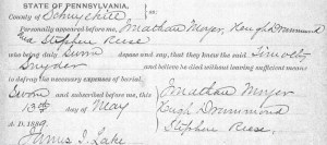 Excerpt from the Application for Burial of Deceased Soldier made by Timothy M. Snyder’s friends on his behalf, 13 May 1889 (Schuylkill County burial records, public domain).