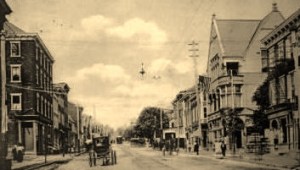 Horse and buggy drivers pass new telephone poles on Ashland, Pennsylvania’s West Centre Street (early 1900s, public domain).