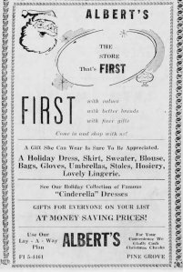 Advertisement, Albert’s Store, Pine Grove, Pennsylvania (West Schuylkill Press and Pine Grove Herald, 23 November 1960, public domain; click to enlarge).