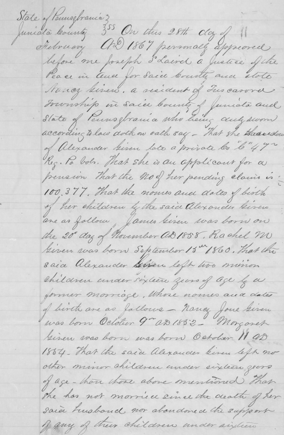 Nancy Given’s U.S. Civil War Widow’s Pension Claim, Nancy’s Feb 1867 Affidavit, pp. 1-2_pubdom