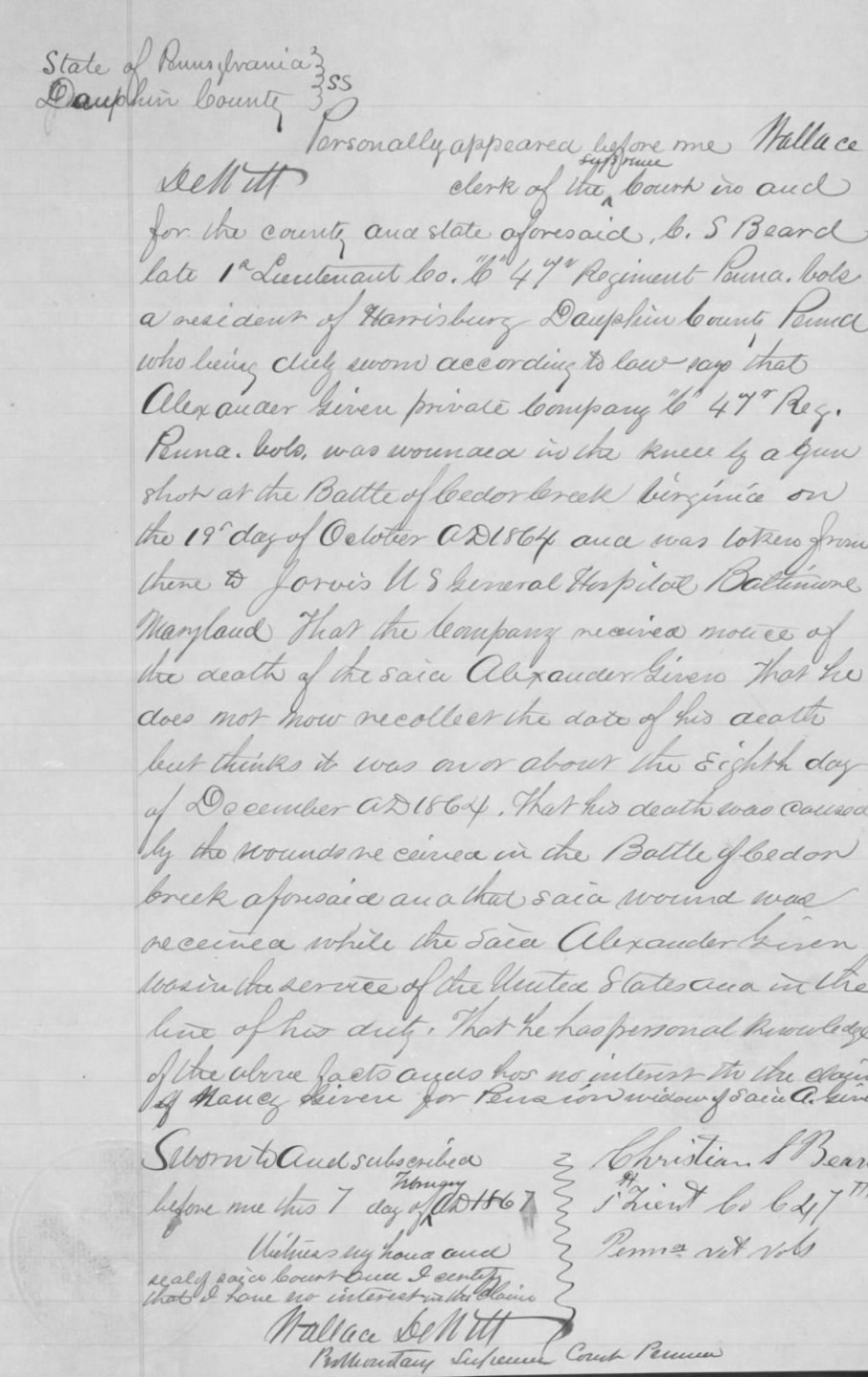 Nancy Given’s U.S. Civil War Widow’s Pension Claim, (First Lieutenant Christian S. Beard’s 1867 attestation re: Private Alexander Given’s military service with the 47th Pennsylvania Volunteers and his 1864 death in battle, p. 1, U.S. Civil War Widows’ Pension Files, U.S. National Archives and Records Administration, public domain).