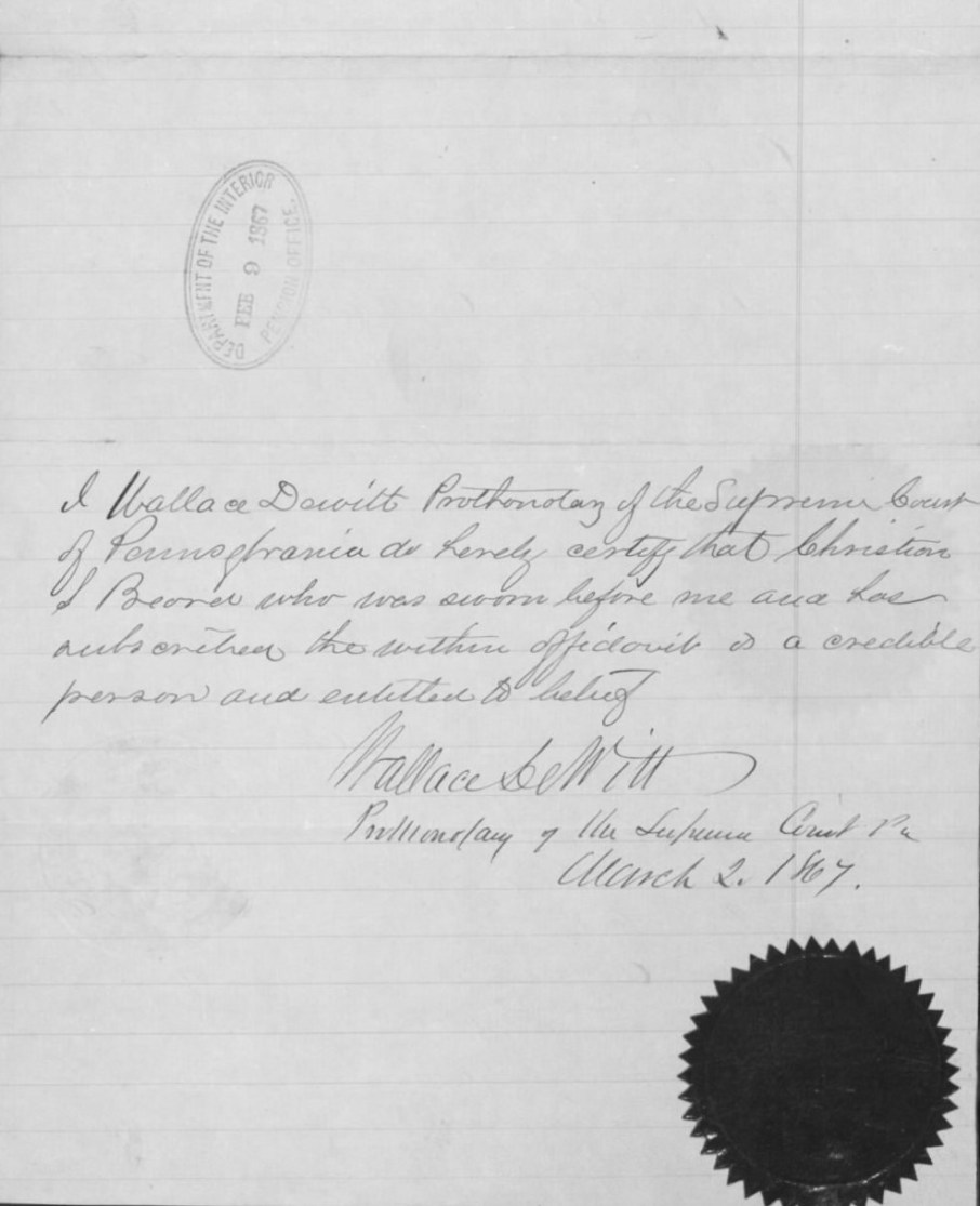 Nancy Given’s U.S. Civil War Widow’s Pension Claim, (First Lieutenant Christian S. Beard’s 1867 attestation re: Private Alexander Given’s military service with the 47th Pennsylvania Volunteers and his 1864 death in battle, p. 2, U.S. Civil War Widows’ Pension Files, U.S. National Archives and Records Administration, public domain).