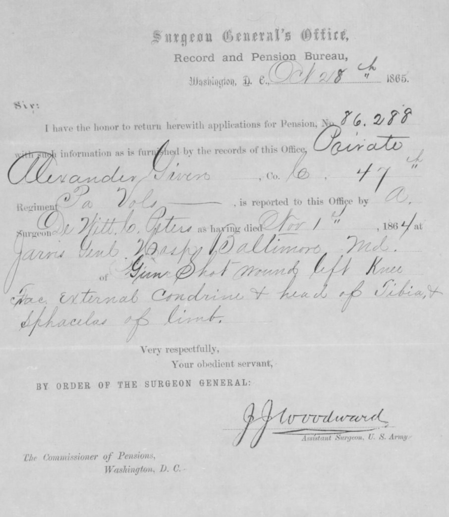 U.S. Surgeon General’s 28 October 1865 Confirmation of Private Alexander Given’s Military Service and 1864 Battle Wound Death (U.S. Civil War Widows’ Pension Files, U.S. National Archives and Records Administration, public domain).