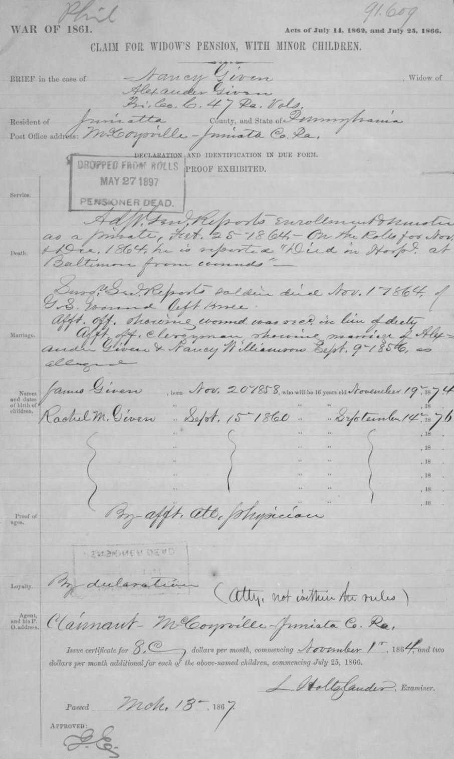History of the U.S. Civil War Widow’s and Orphans’ Pension Claims filed by Nancy (Barton Williamson) Given, the widow of Private Alexander Given, 47th Pennsylvania Volunteers (U.S. Civil War Widows’ and Orphans’ Pension Files, U.S. National Archives and Records Administration, public domain).